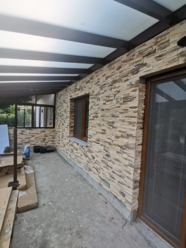 Majitelka měla hotové zasklení zimní zahrady a chtěla udělat novou elektroinstalaci v zahradě + vývod na zahradní chatku pro nářadí, obložit stěnu umělým kamenem a položit dlažbu. Součástí realizace bylo také obložení soklu celého domu a instalace osvětlení okolo chodníku.
