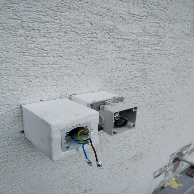 Zákazník zateploval dům 160mm polystyrenem a potřeboval udělat přípravu na zásuvky a vývody. Stavají vývody byli prodloužené a nainstalovaní krabice s prodloužením. Na místa, kde budou kamery, byli dány vynášecí desky pro snadnou instalaci kamer , světel atd. Instalace na 2 domy zabrala den práce.